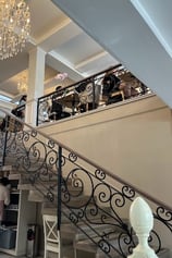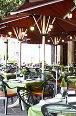 An elegant restaurant located in a restored 18th century estate, with leafy outdoor seating and a fountain.